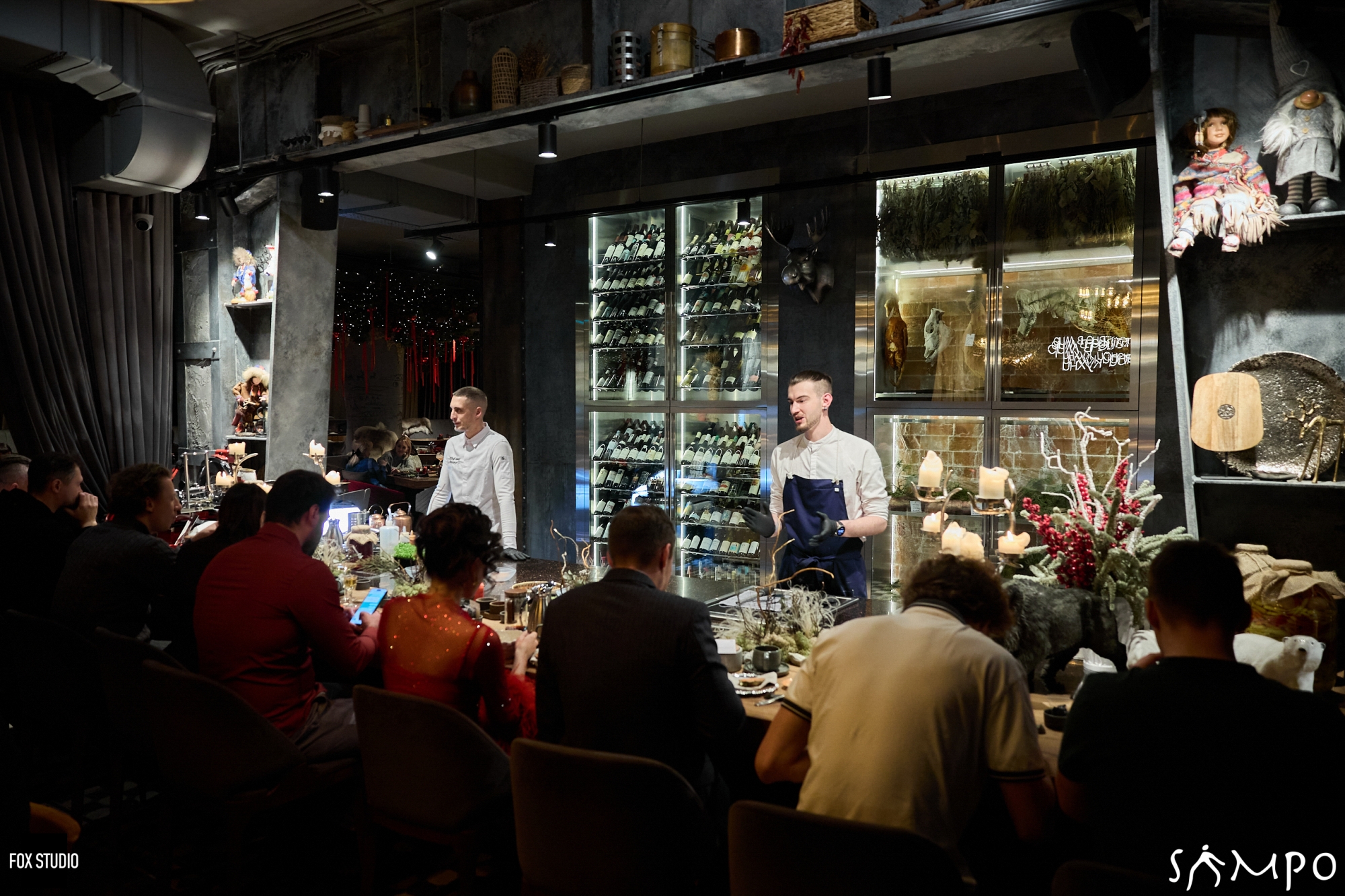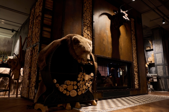 А пятый и самый видимый источник живого огня в SAMPO — дровяной камин в центре зала, создающий неповторимую атмосферу тепла и дополняющий собой оригинальный интерьер, где органично собраны в единую концепцию камень, дерево, железо, мех и огонь.