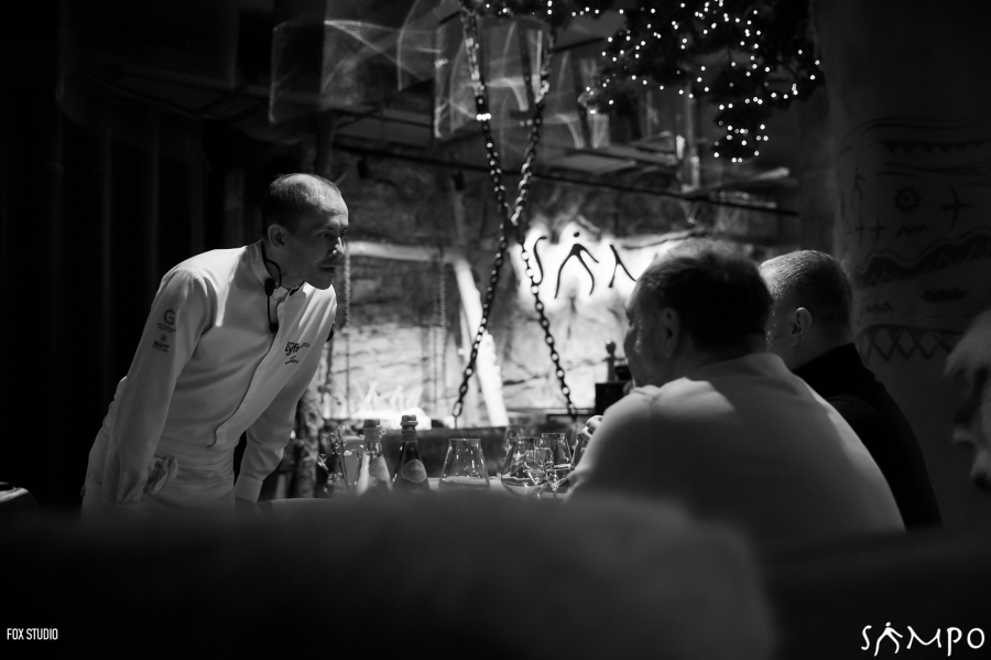 А пятый и самый видимый источник живого огня в SAMPO — дровяной камин в центре зала, создающий неповторимую атмосферу тепла и дополняющий собой оригинальный интерьер, где органично собраны в единую концепцию камень, дерево, железо, мех и огонь.